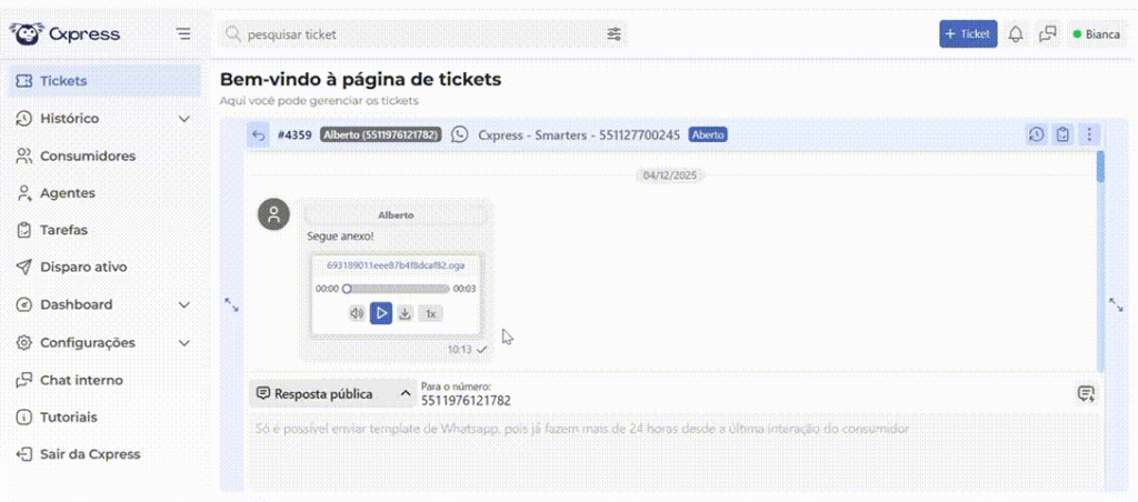 Para agilizar o trabalho dos agentes, a Cxpress passa a permitir acelerar a reprodução dos áudios enviados pelos consumidores nas mensagens dos tickets.