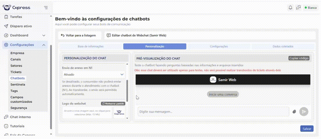 - Primeira mensagem, frase de encerramento e transcrição preenchidas automaticamente